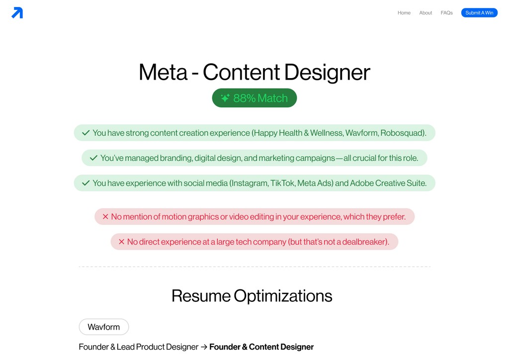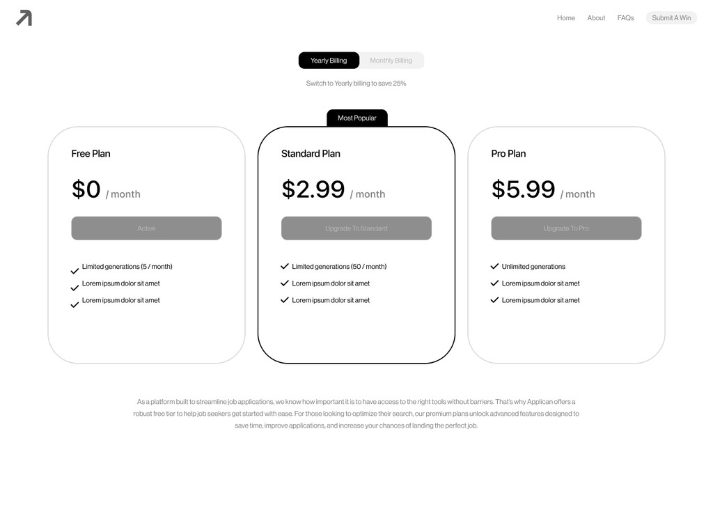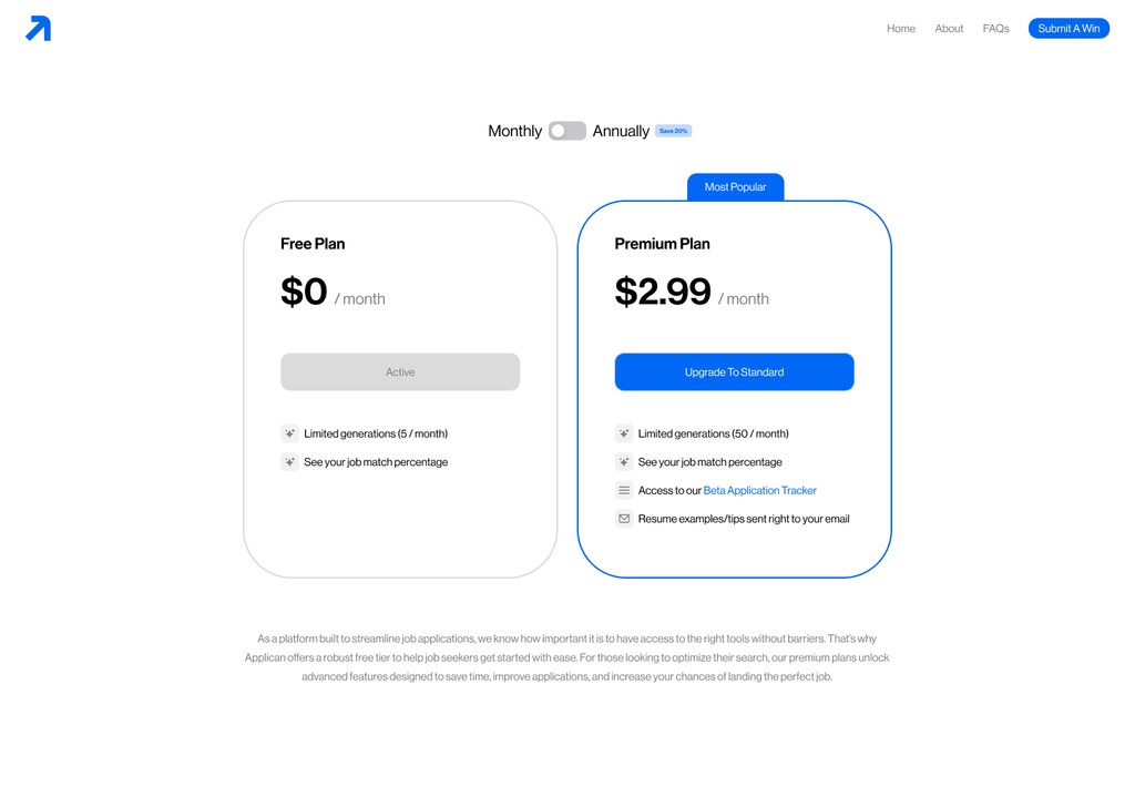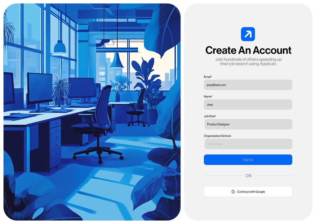 In designing Applican’s branding and MVP, I focused on usability, accessibility, and speed while ensuring a welcoming experience for those still skeptical of AI. The goal was to create an intuitive tool that cost less than a cup of coffee and empowers job seekers to focus on improving their skills, not just their resumes. By making AI approachable and efficient, Applican removes barriers, helping users apply to jobs smarter and faster without the extra stress.