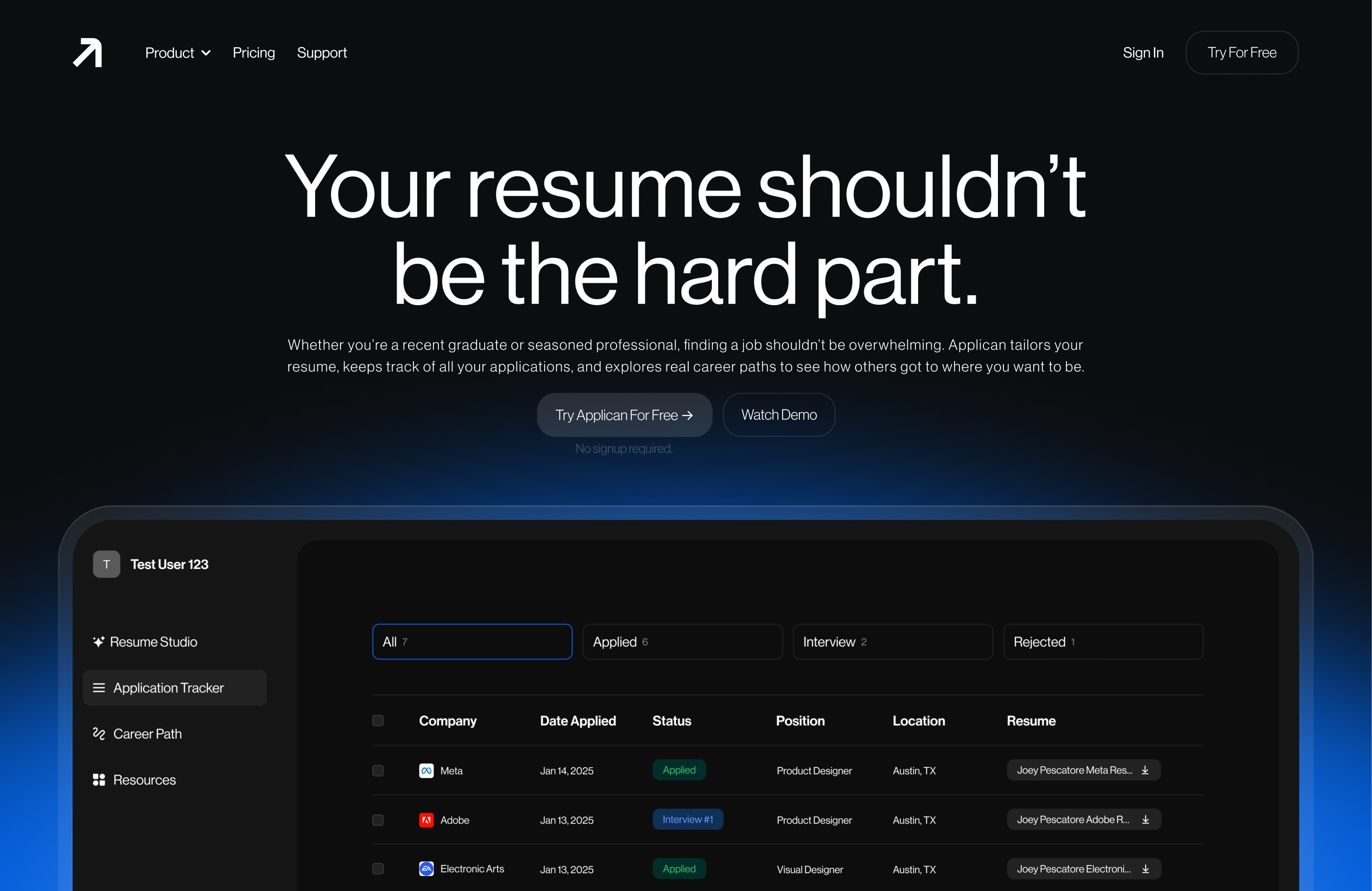 Many job seekers struggle with the exhausting process of tailoring resumes for every job, and many are also hesitant about AI usage in professional spaces. Applican was built to eliminate this friction, helping users create optimized applications without wasting time on repetitive edits.